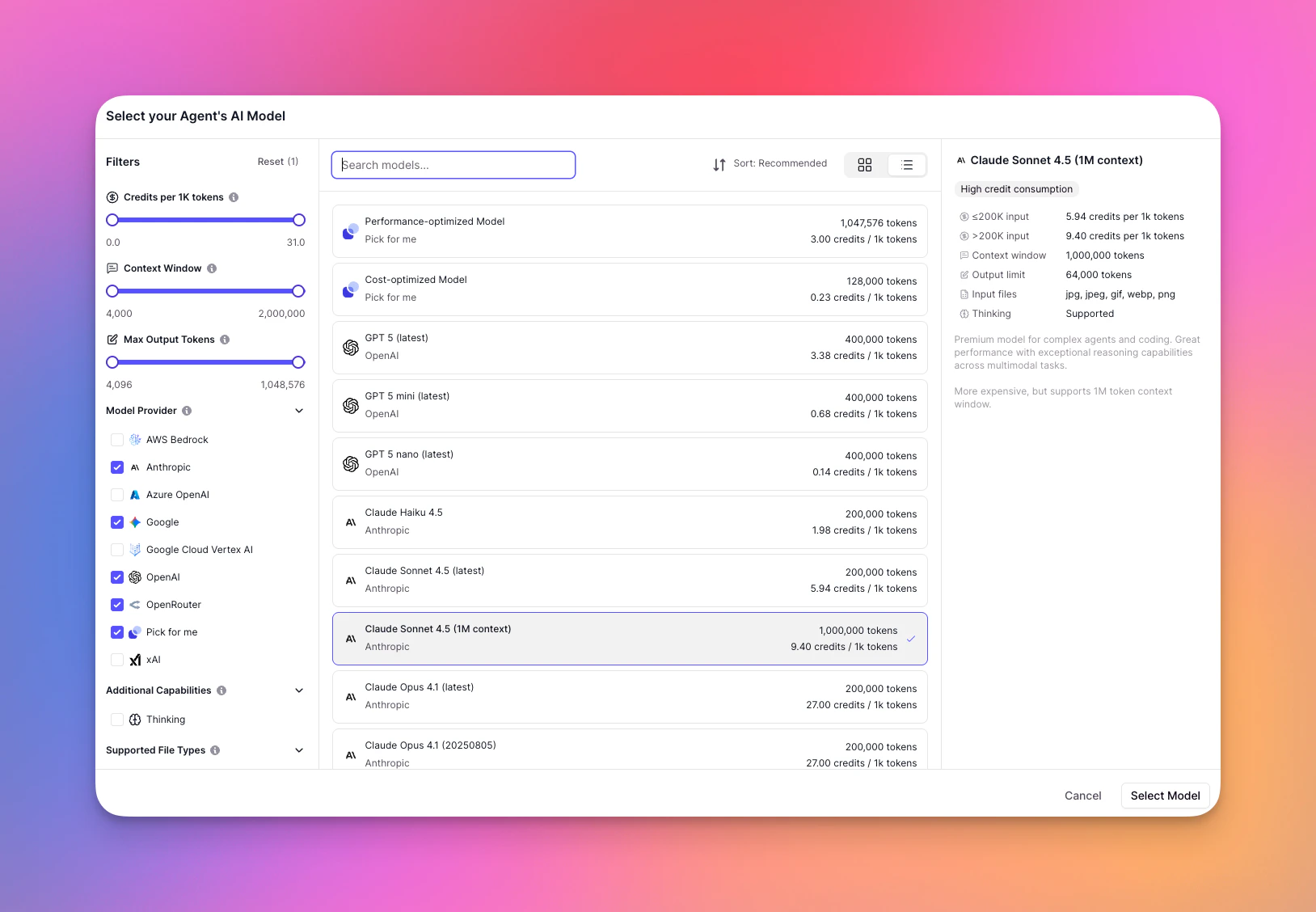 When selecting a model for your Agent, you can use the model selection modal to find the perfect fit for your needs. The interface provides powerful filtering, sorting, and search capabilities to help you compare models at a glance.