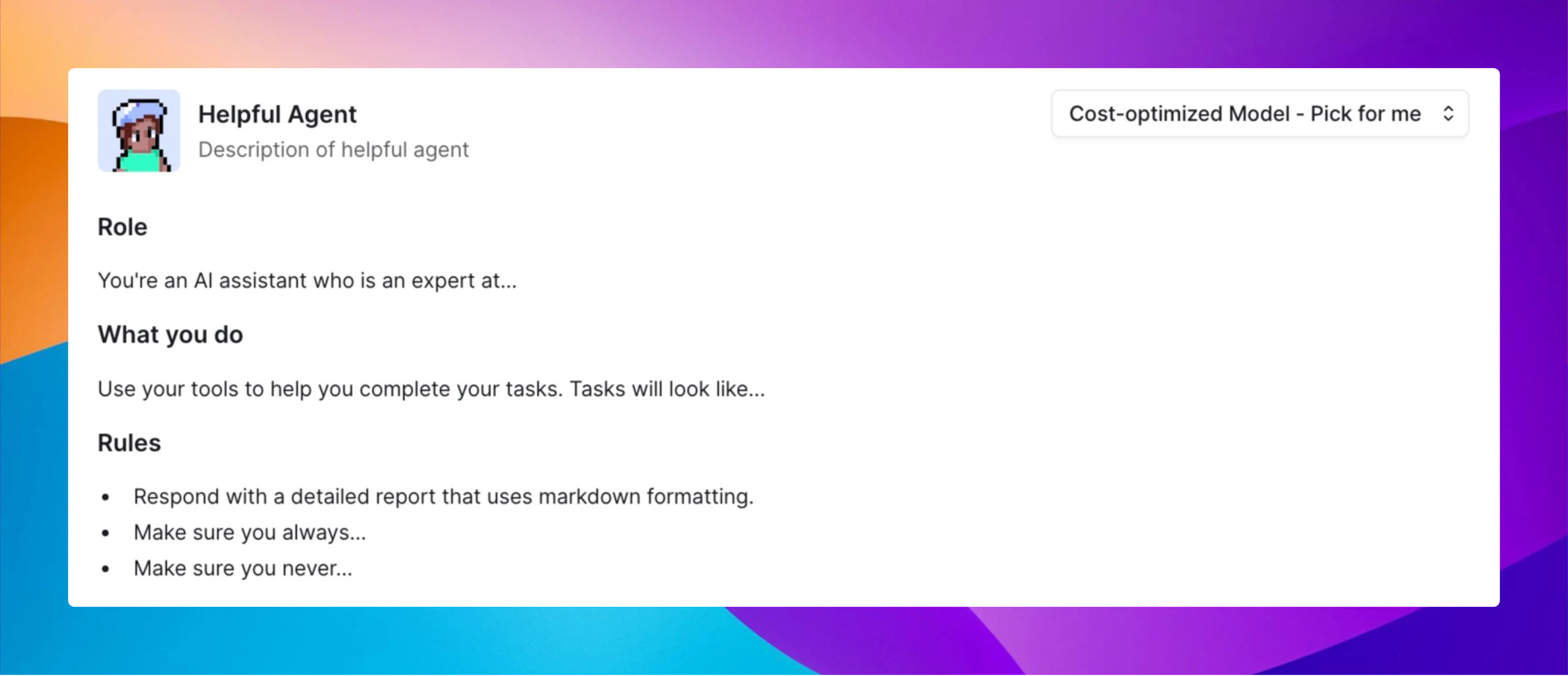 Relevance AI automatically selects the best model for your Agent based on performance or cost, no action needed. You’re more than welcome to choose the model the suits your Agent’s needs.